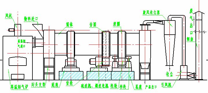 干燥的濕物料由皮帶輸送機或斗式提升機送到料斗,然后經料斗的加料機通過加料管道進入加料端。加料管道的斜度要大于物料的自然傾角,以便物料順利流入干燥器內。干燥器圓筒是一個與水平線略成傾斜的旋轉圓筒。物料從較高一端加入,載熱體由低端進入,與物料成逆流接觸,也有載熱體和物料一起并流進入筒體的。隨著圓筒的轉動物料受重力作用運行到較底的一端。濕物料在筒體內向前移動過程中,直接或間接了載熱體的給熱,使濕物料得以干燥,然后在出料端經皮帶機或螺旋輸送機送出。在筒體內壁上裝有抄板,它的作用是把物料抄起來又撒下,使物料與氣流的接觸表面增大,以提高干燥速率并促進物料前進。載熱體一般分為熱空氣、煙道氣等。載熱體經干燥器以后,一般需要旋風除塵器將氣體內所帶物料捕集下來。如需進一步減少尾氣含塵量,還應經過袋式除塵器或濕法除塵器后再放排放。